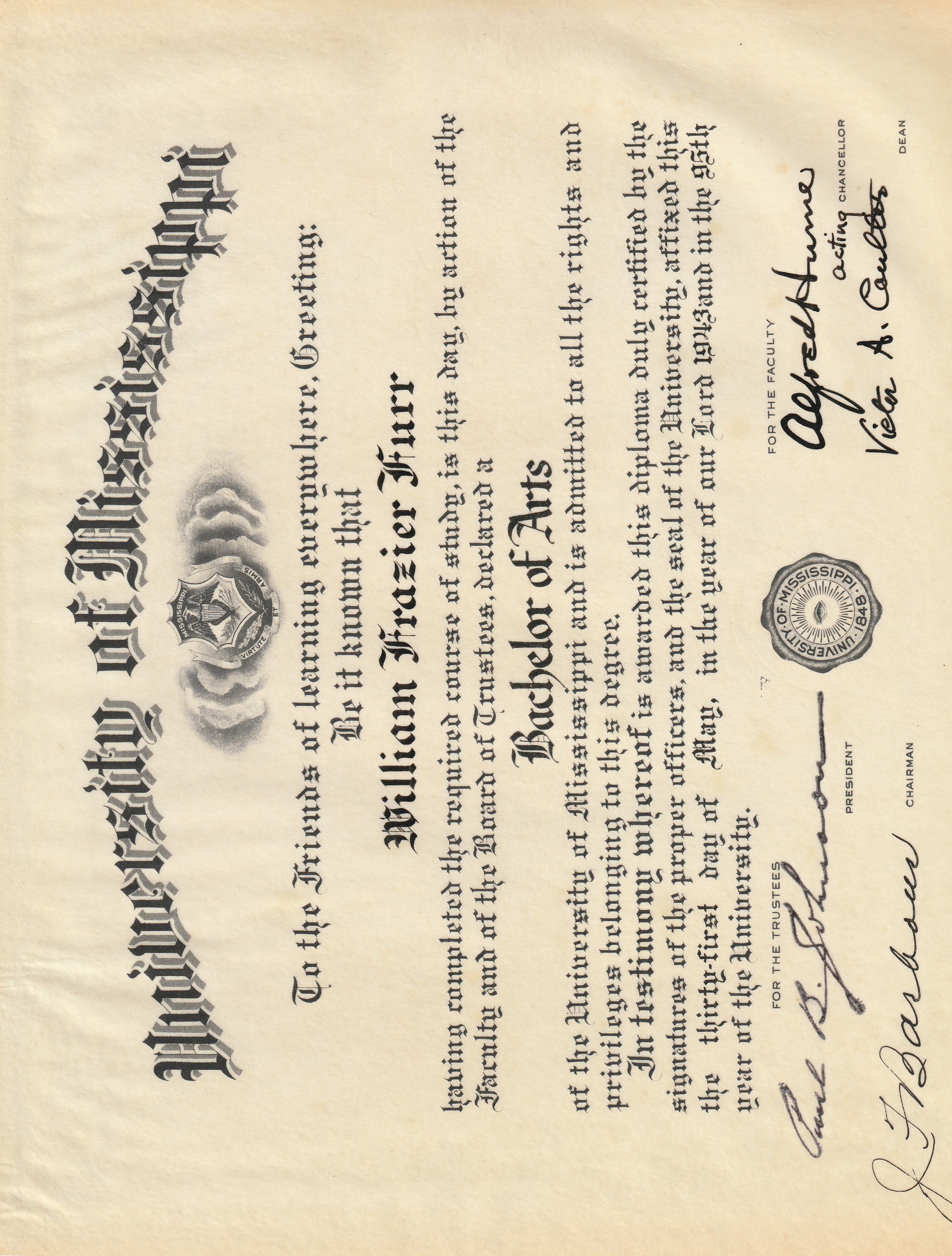 William Frazier Furr, the first born son of Dr. Esta Furr, DDS and Lottie Winnafred Hansell, was born