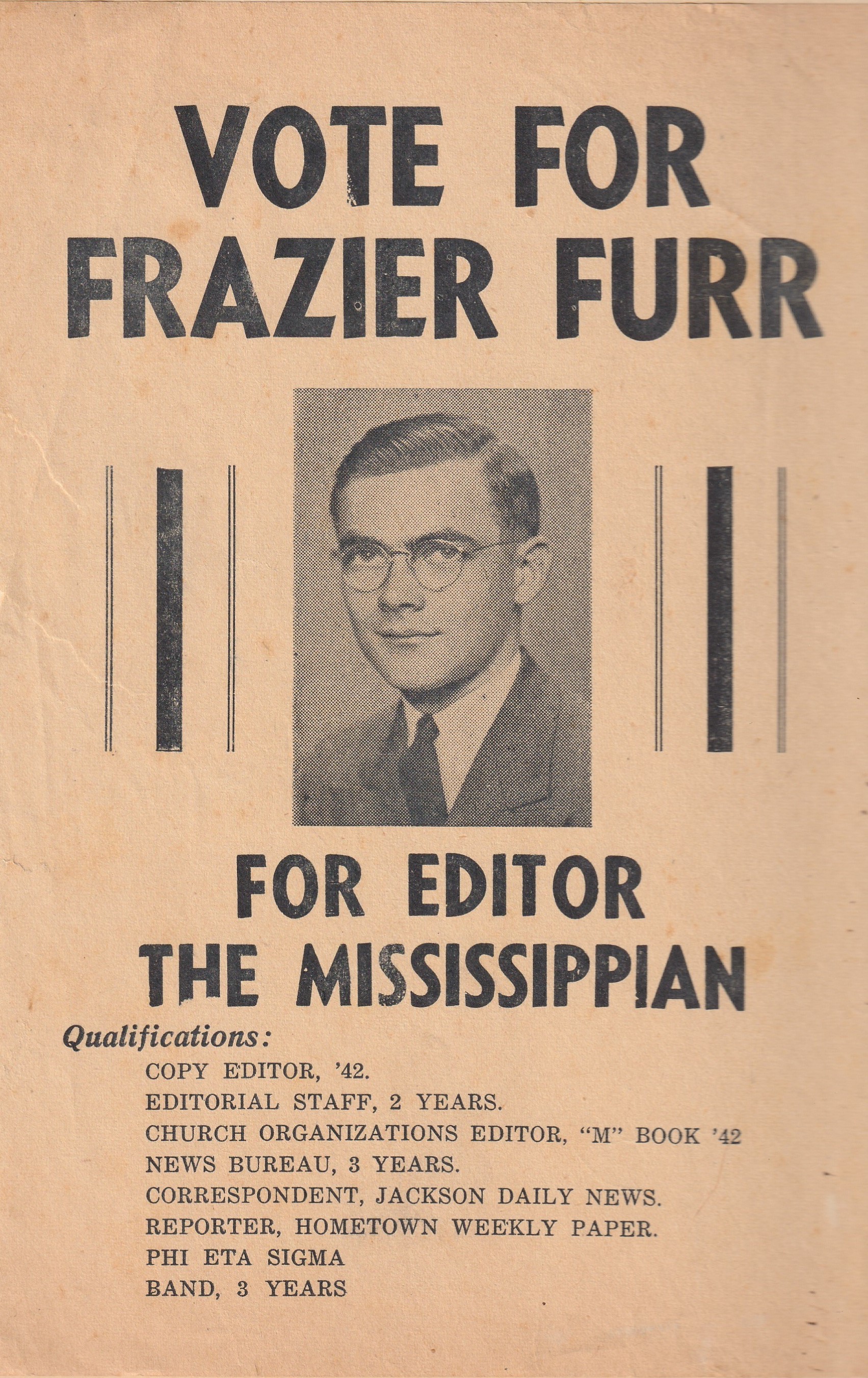 Just a few days after I came to Ole Miss and after I had all my classes and schedules straightened out, I started working for Dr. Silver as a N.Y.A. helper. I soon saw that I was getting very little benefit from being general flunky for him; so as soon as I got an offer to work in the News Bureau I immediately took it. I have been working hard there both to improve my skills so that I will be better able to sometimes take a better position and to make enough money with which to pay expenses to go to school. I think that working in the News Bureau has given me not only a better insight into the complications of our University but also social and business connections with people whom I enjoy and who can help me.