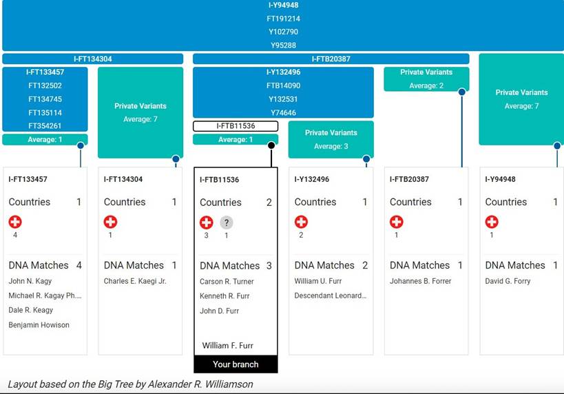 lines descended from the I-FTB20387 ancestor. One line is that of Johannes Forrer while the second line is that of the I-Y132496 Furr